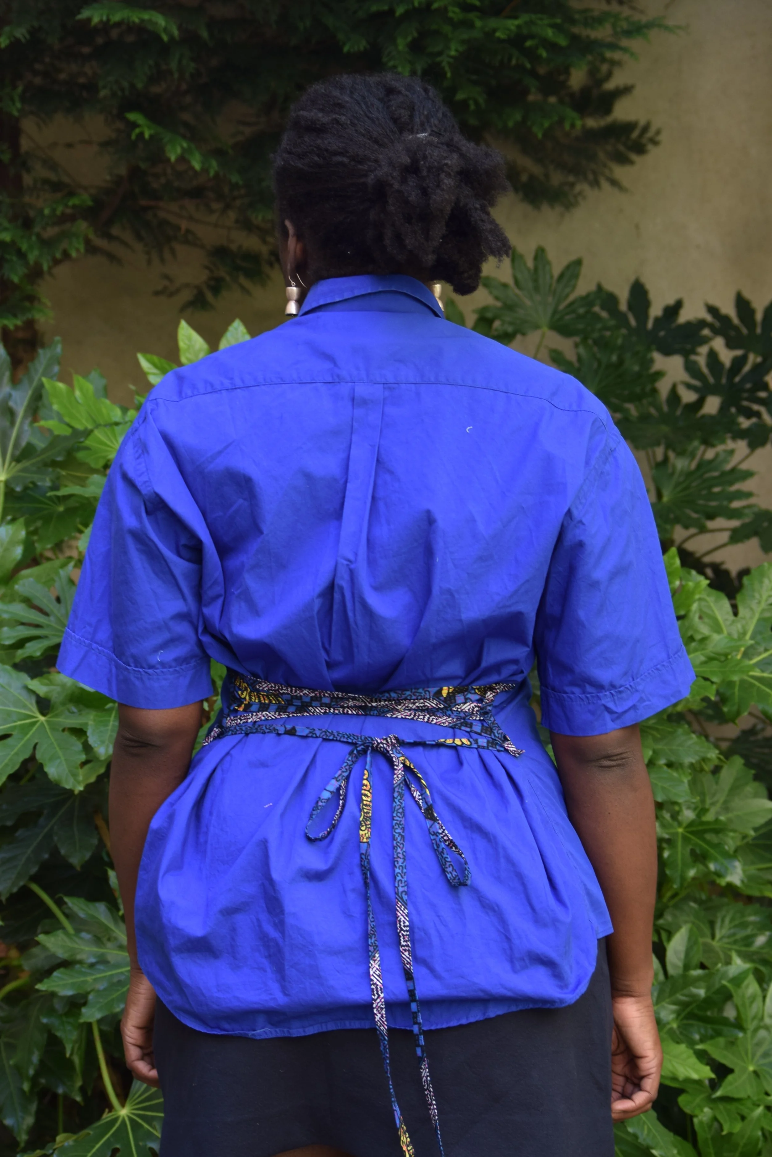 Je donne une seconde vie à une chemise de seconde main avec une jupe en wax qu’on m’a donnée. Le résultat: une chemise d’été qui peut s’ouvrir et se fermer dans le dos. C’est parti !